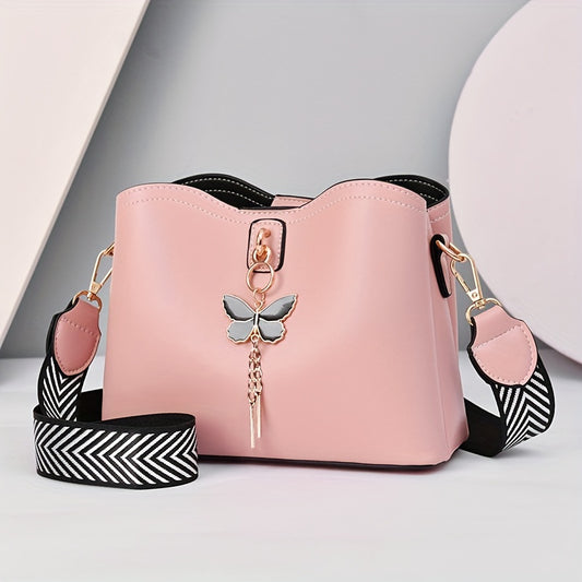 Women's Butterfly Decor Bucket Bag with Geometric Strap