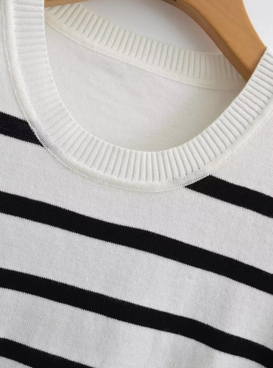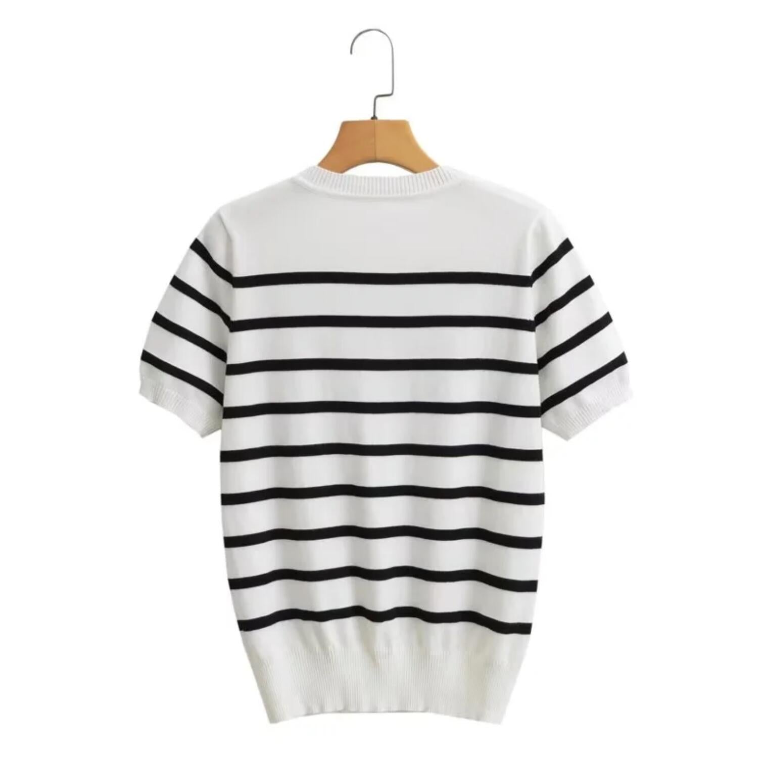 Summer Knitting Striped Crew Collar Sweater Vintage Short Sleeve